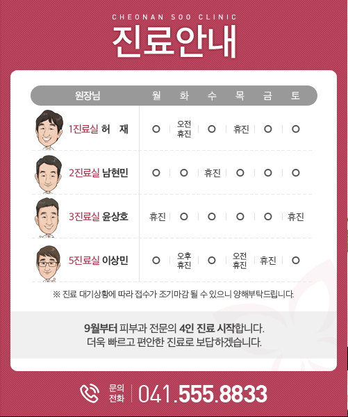천안수피부과의원 9월부터 피부과 전문의 4인 진료 시작합니다.